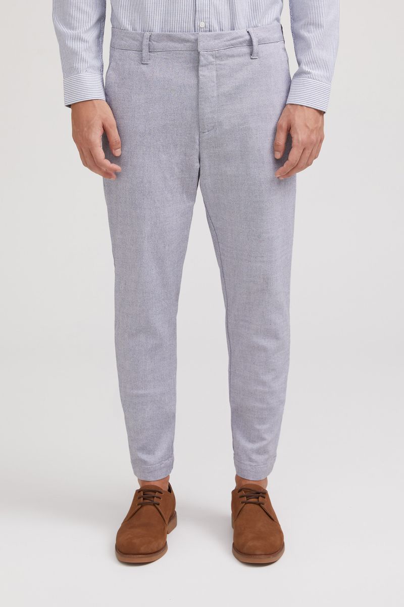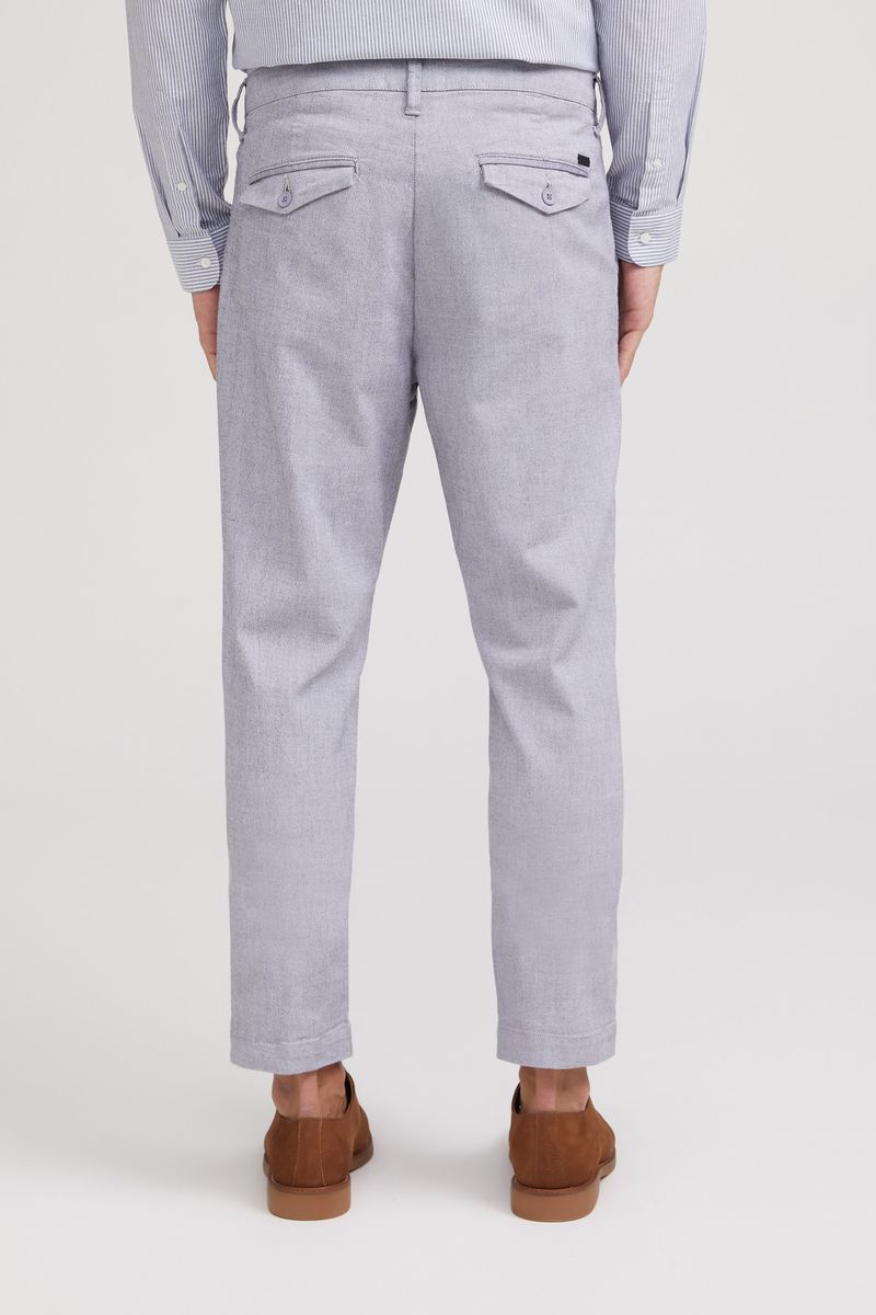 Calça Oxford Toquio modelagem casual em corte de alfaiataria. Bolsos frontais faca, bolsos traseiros envelope com abotoamento externo. Fecho frontal com zíper de metal e gancho embutido, cós com passadores para uso de cinto.