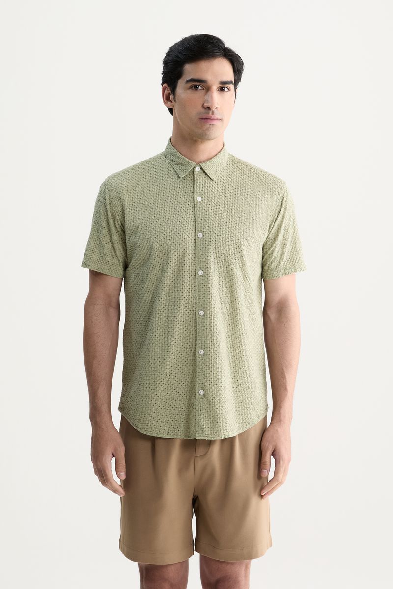 Os detalhes do design incluem um padrão texturizado sutil e botões claros que contrastam harmoniosamente com o tom terroso da peça. O colarinho clássico complementa o visual, proporcionando um toque de elegância casual. Esta camisa tem tudo para se tornar uma peça-chave no seu guarda-roupa, oferecendo autenticidade e sofisticação em cada detalhe.