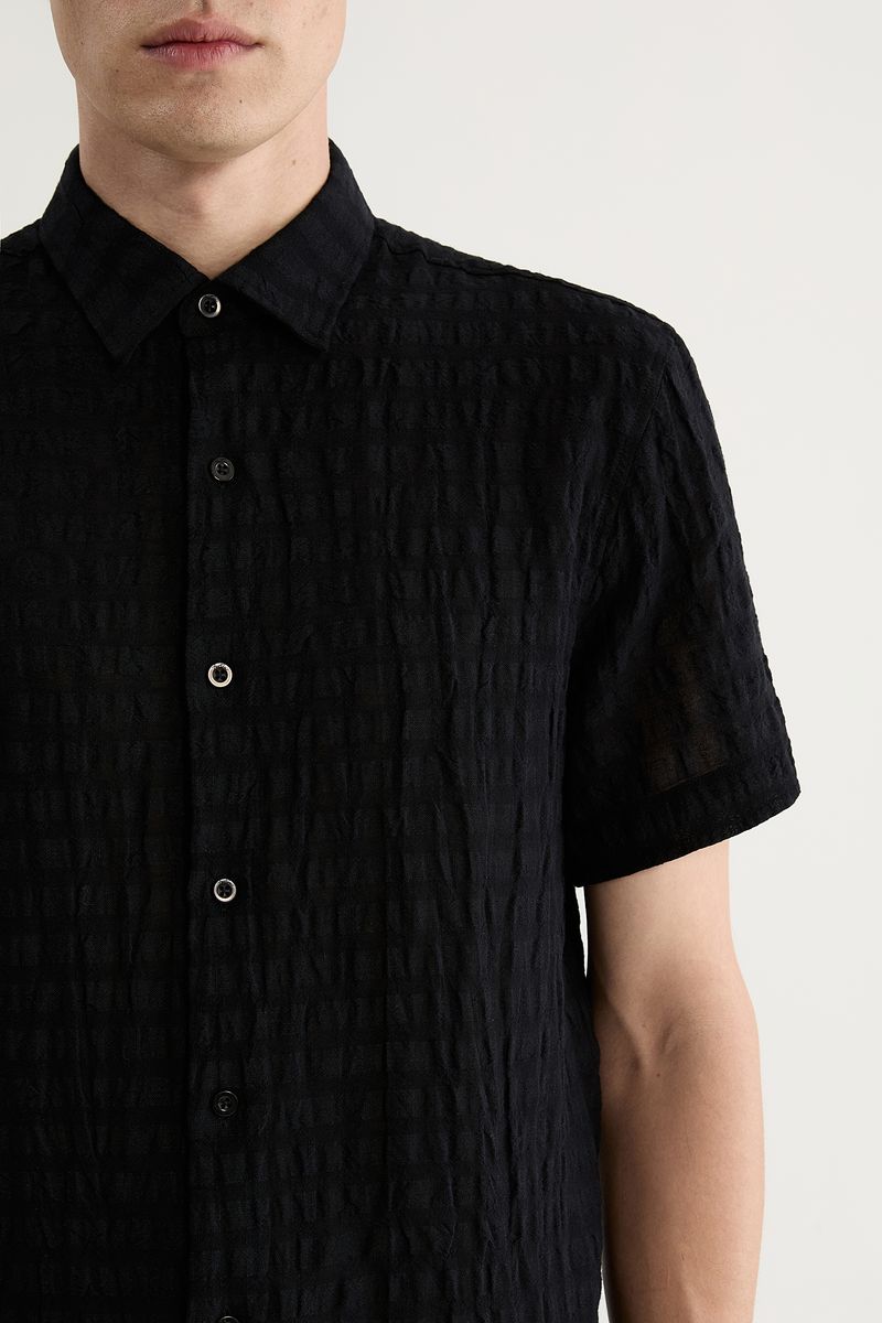 Camisa Manga Curta Linho Havana Dark é confeccionada em crepe maquinetado em linho e algodão, exclusivo Foxton. O tecido de linho misto oferece leveza e respirabilidade, com caimento suave. A modelagem é confortável e contemporânea, e o padrão texturizado quadriculado confere um toque moderno ao visual.