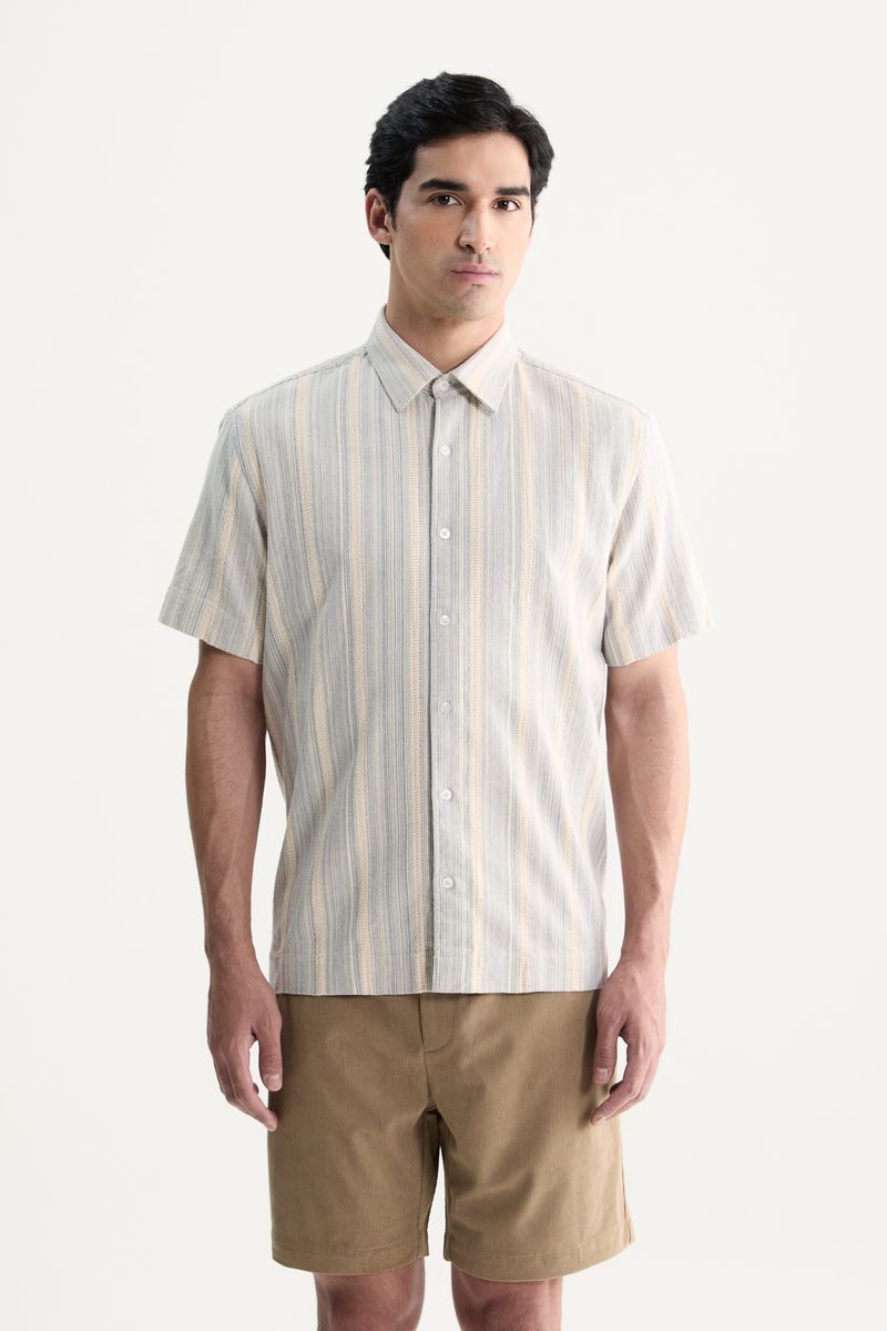 A Camisa Manga Curta Listra Náutica possui modelagem levemente quadrada, proporcionando um caimento moderno e despojado. Confeccionada em tecido 100% algodão com listras texturizadas, oferece conforto e toque suave. O tecido exclusivo Foxton agrega autenticidade e estilo único à peça.