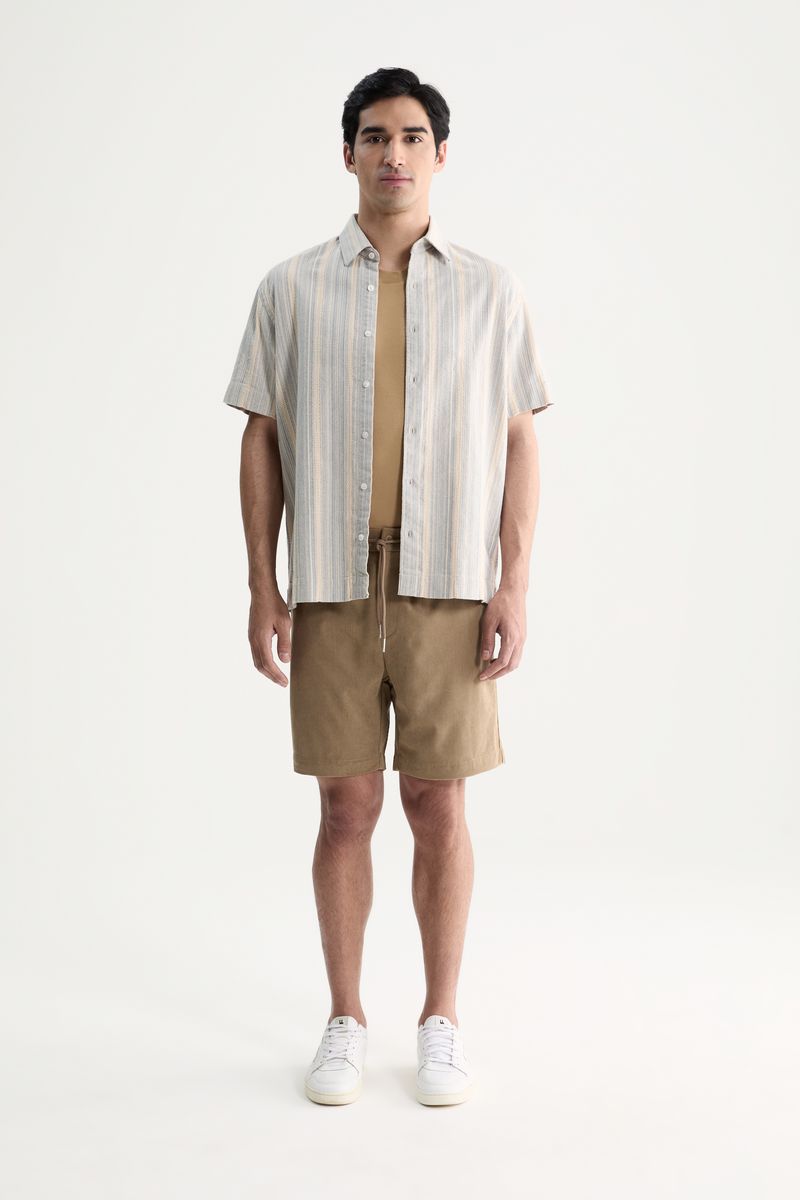 Camisa de manga curta com modelagem levemente quadrada, proporcionando um caimento moderno e despojado. Confeccionada em tecido 100% algodão com listras texturizadas, oferece conforto e toque suave. O tecido exclusivo Foxton agrega autenticidade e estilo único à peça.