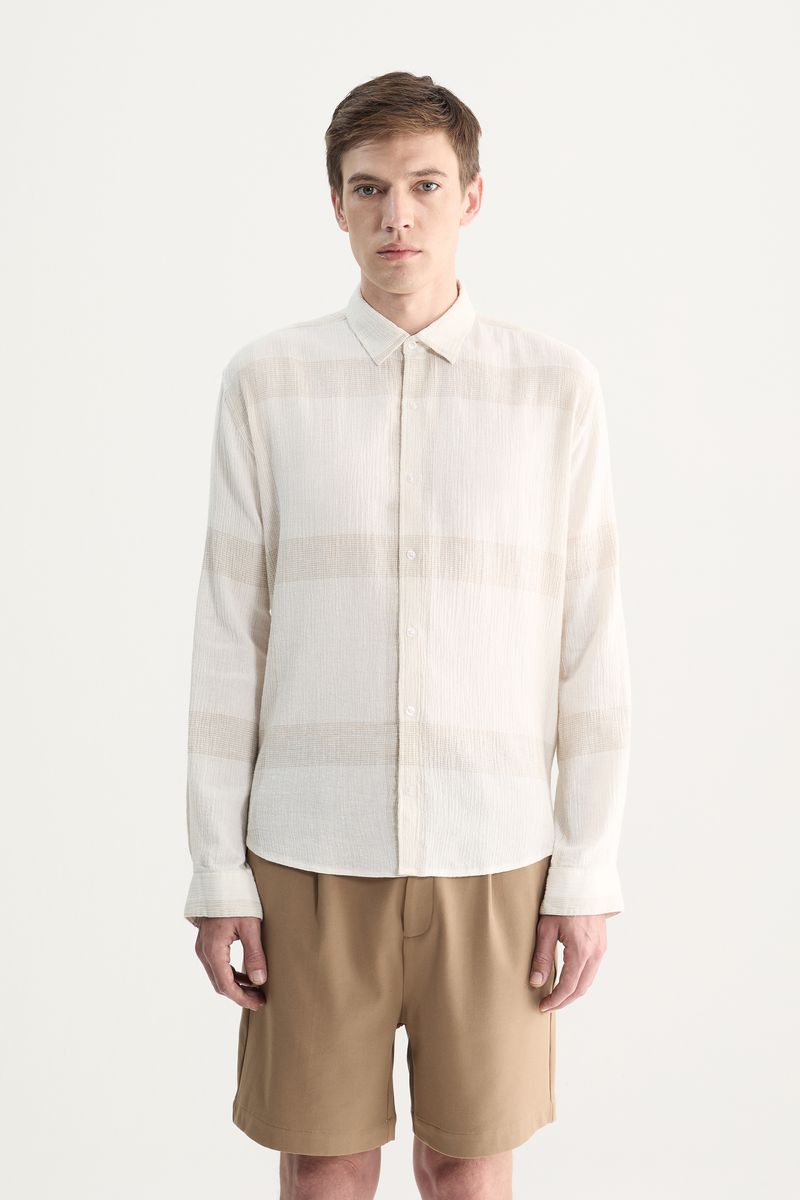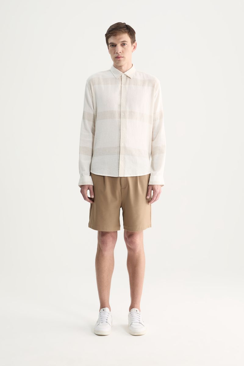 Camisa Manga Longa Linho Grid é uma peça Foxton, confeccionada em tecido de linho misto com viscose, garantindo toque suave e caimento leve. O desenho exclusivo em grid traz uma harmonia de linhas que confere um look moderno e sofisticado, com abotoamento frontal discreto e colarinho clássico que realça o corte elegante. É sucesso de vendas, observando a harmonia do casamento do xadrez.