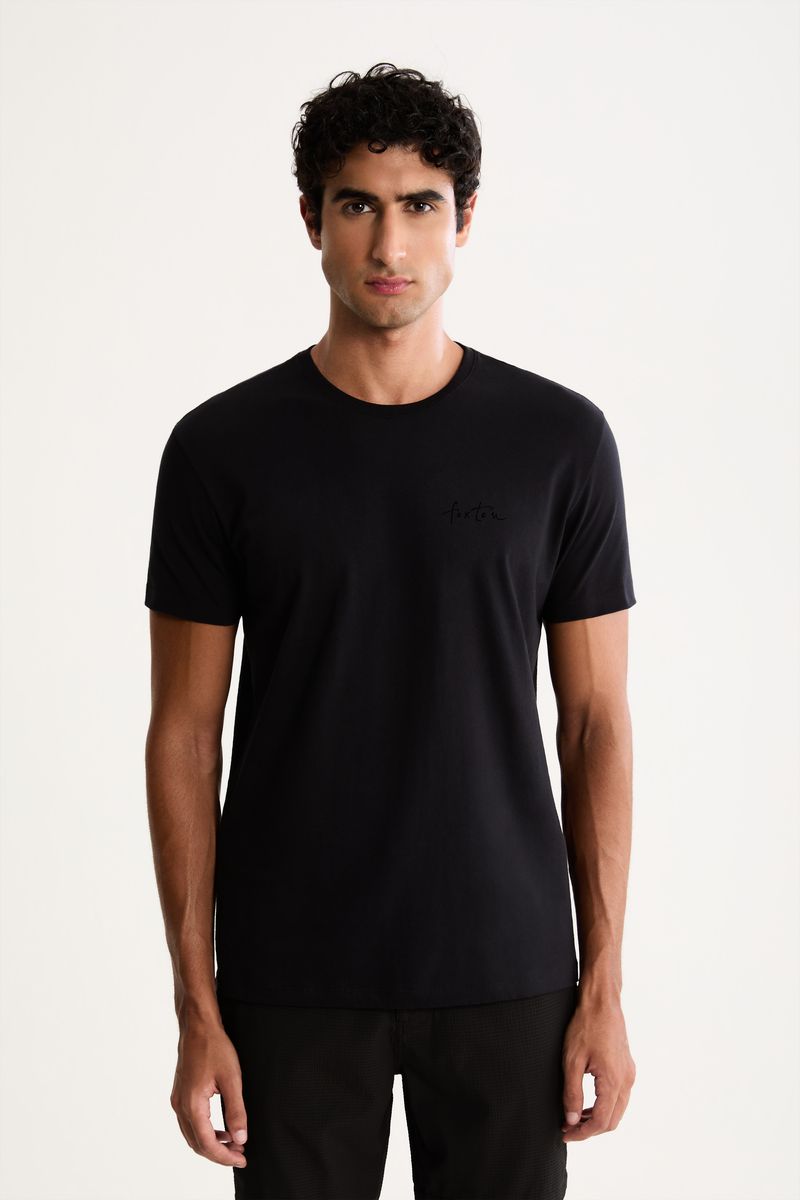 O caimento regular é confortável, com mangas curtas e gola arredondada. O corte reto acompanha o corpo sem marcar, e o logotipo discreto no peito adiciona identidade sem excessos, tornando a peça versátil para várias ocasiões.