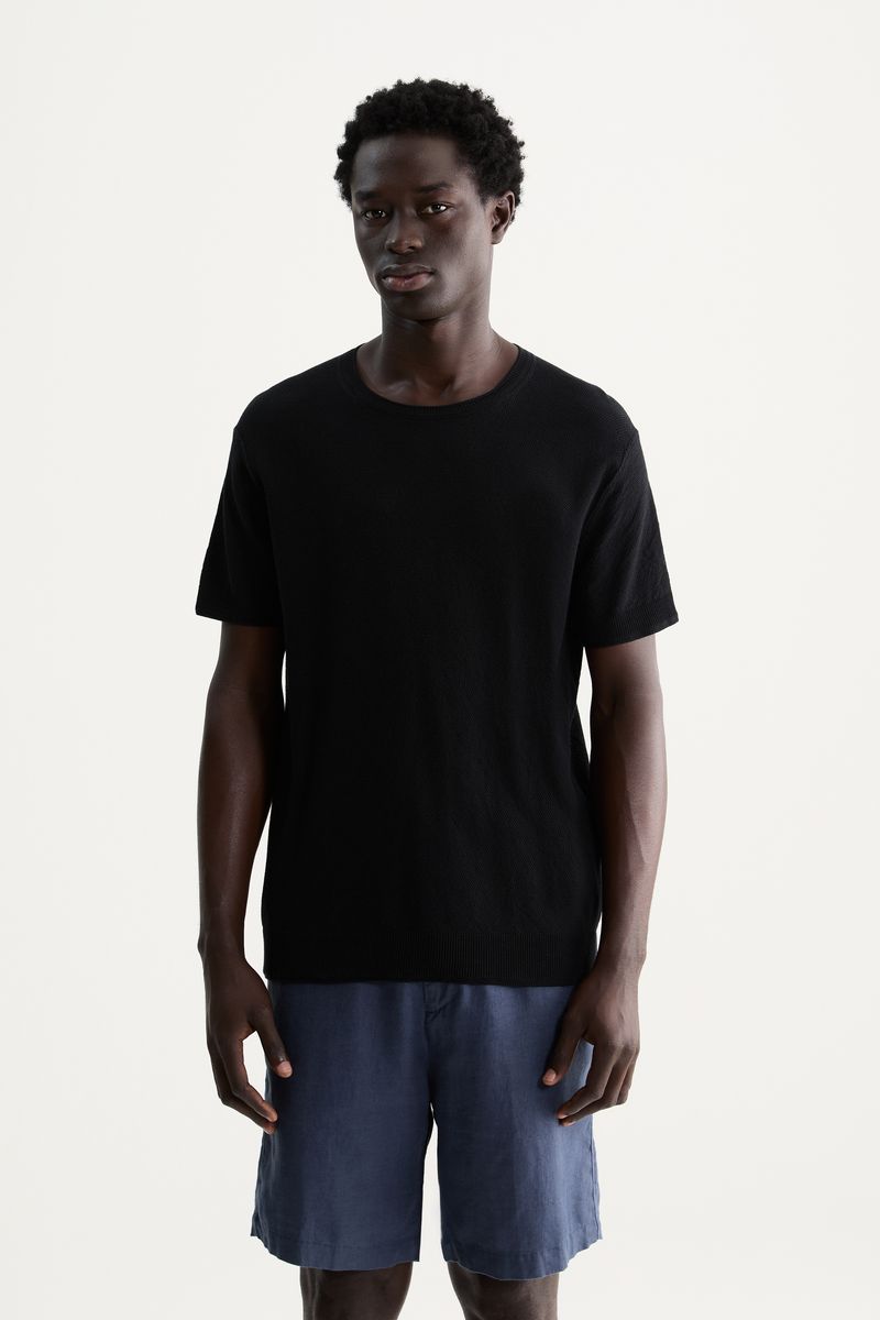 A camiseta tem acabamentos especiais canelados, na gola, na barra e nas mangas. É uma peça com modelagem regular de camiseta e matéria-prima diferenciada.