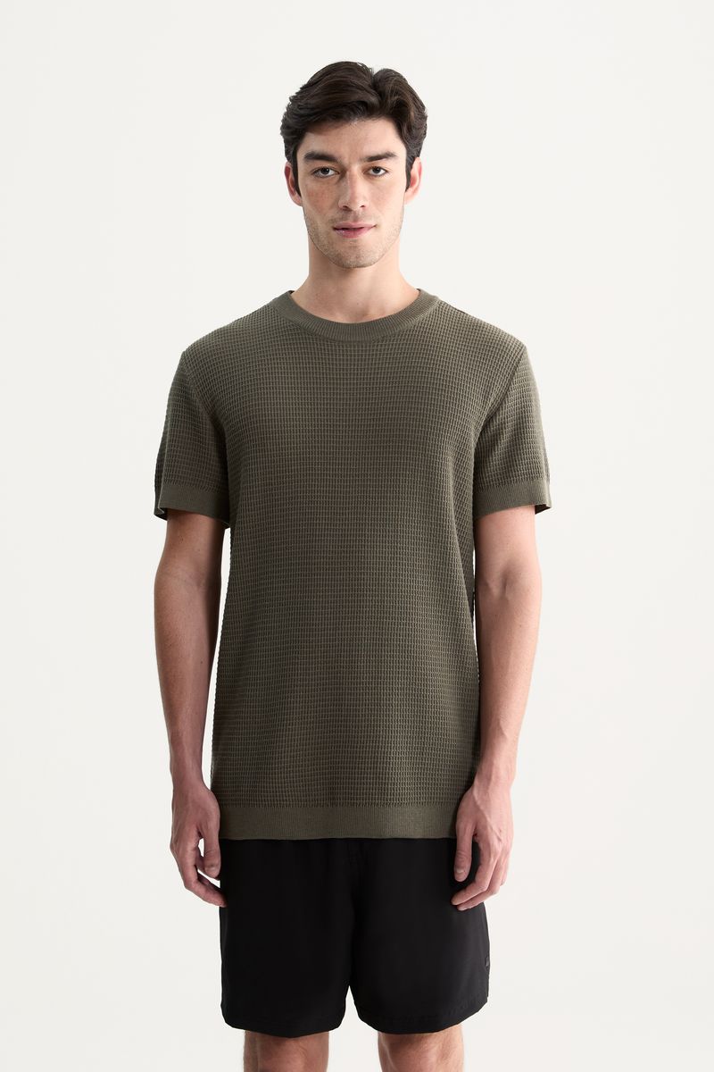 Camiseta Tricot Saint Michel é confeccionada em 50% algodão, 50% acrílico, com ponto quadrile que confere uma textura discreta e linear. A peça traz mangas curtas, toque macio e um caimento que sugere elegância casual, perfeita para diferentes momentos do dia.