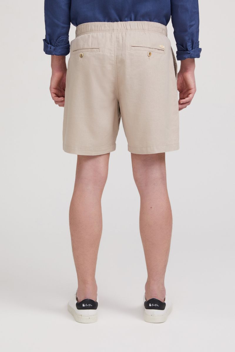 Short Linho Yang com modelagem solta e textura rústica. Bolsos frontais faca, bolsos traseiros de alfaiataria com botão aparente e elástico na cintura.